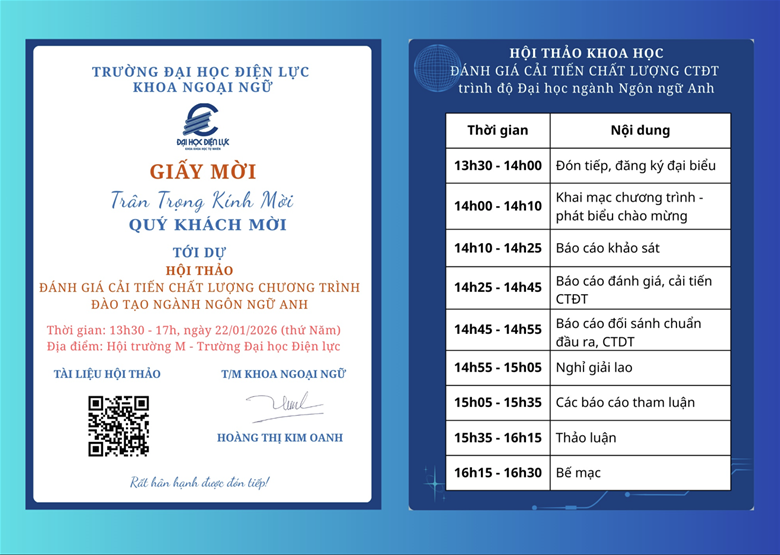 Nhằm không ngừng nâng cao chất lượng đào tạo, cập nhật và hoàn thiện chương trình đào tạo ngành Ngôn ngữ Anh theo yêu cầu thực tiễn và định hướng phát triển giáo dục đại học trong giai đoạn mới, Khoa Ngoại ngữ – Trường Đại học Điện lực trân trọng tổ chức Hội thảo khoa học với chủ đề “Đánh giá, cải tiến chất lượng chương trình đào tạo trình độ Đại học ngành Ngôn ngữ Anh”.