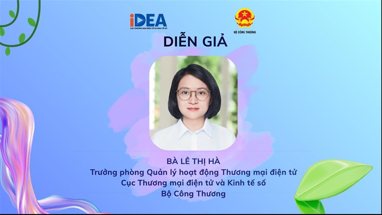 Diễn giả: Bà Lê Thị Hà, Trưởng phòng Quản lý hoạt động thương mại điện tử – Cục Thương mại điện tử và Kinh tế số (Bộ Công Thương)